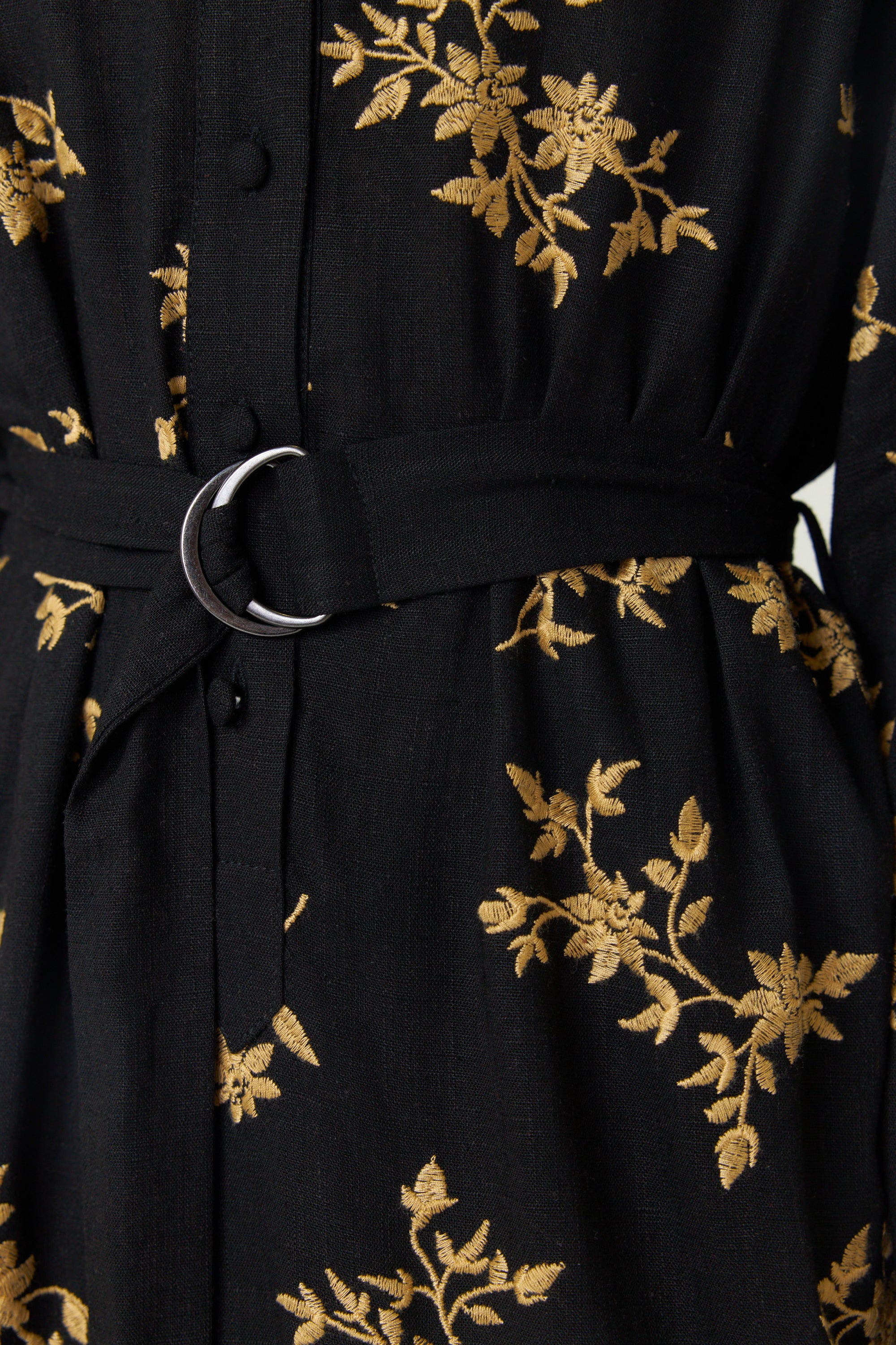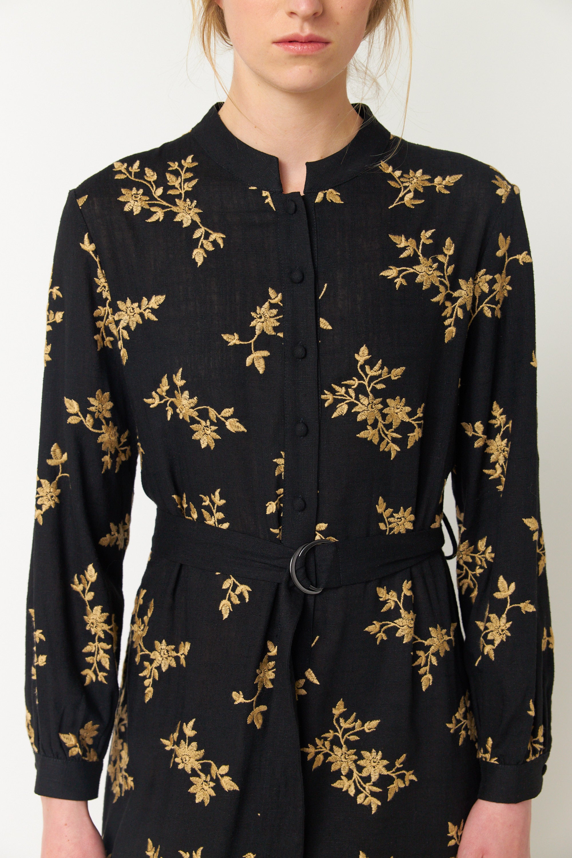 Our Blooms shirt dress is elevated with an elegant blooms embroidery. It features a collar stand and button placket through to waist. This dress is mid calf length and comes with a matching belt and sleeves that gather onto a tailored cuff. This is a dress that can effortlessly take you from café to work and then onto a dinner out.