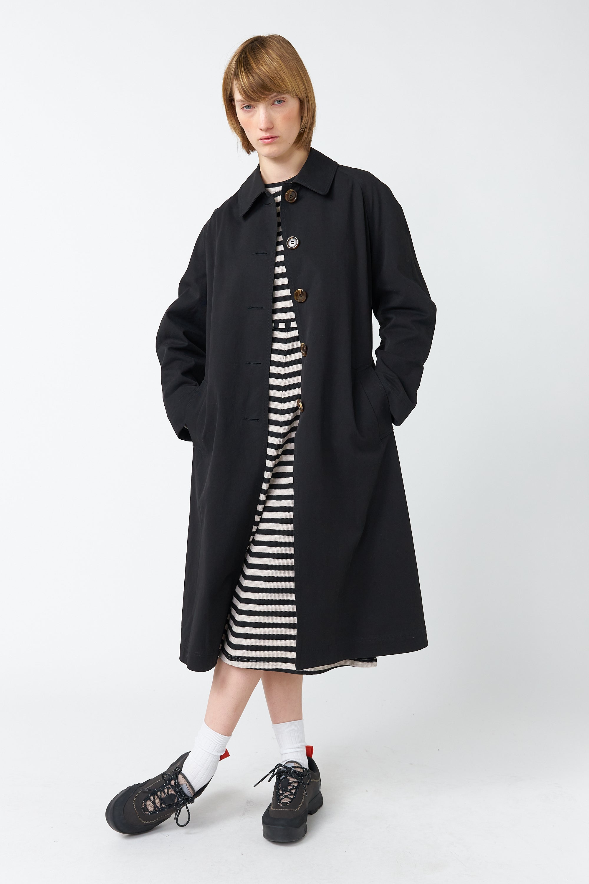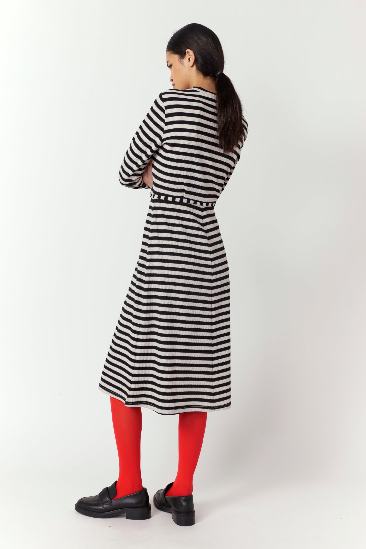 The Stripey dress is a classic Sylvester style with a round neck, long sleeves, flattering shaped waist, and a midi-length, A-line skirt. Pair with trainers for weekend ease or ballet flats for a dinner date and throw on our to take you to work.Nevaeh is 5'8 and wears size 8.