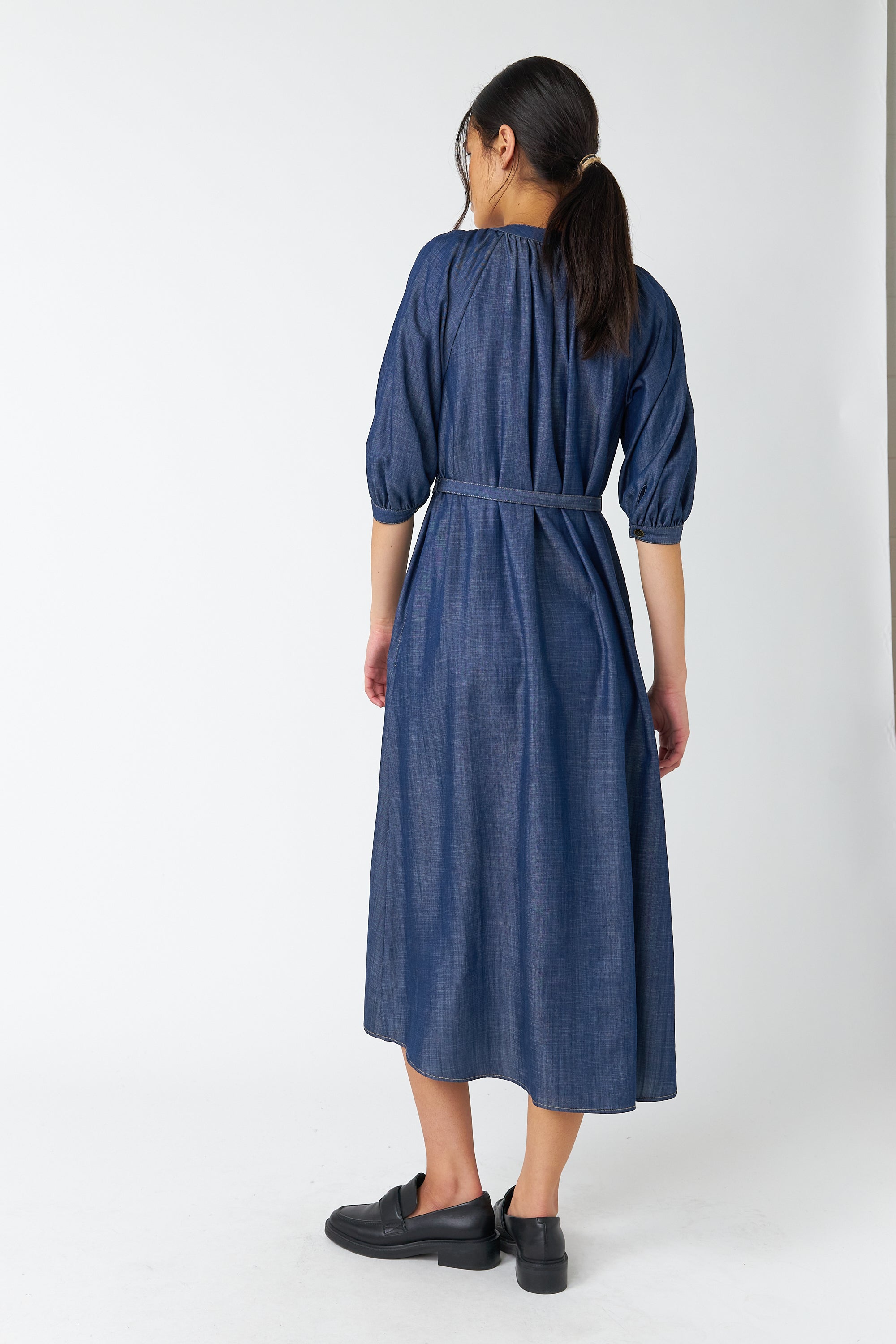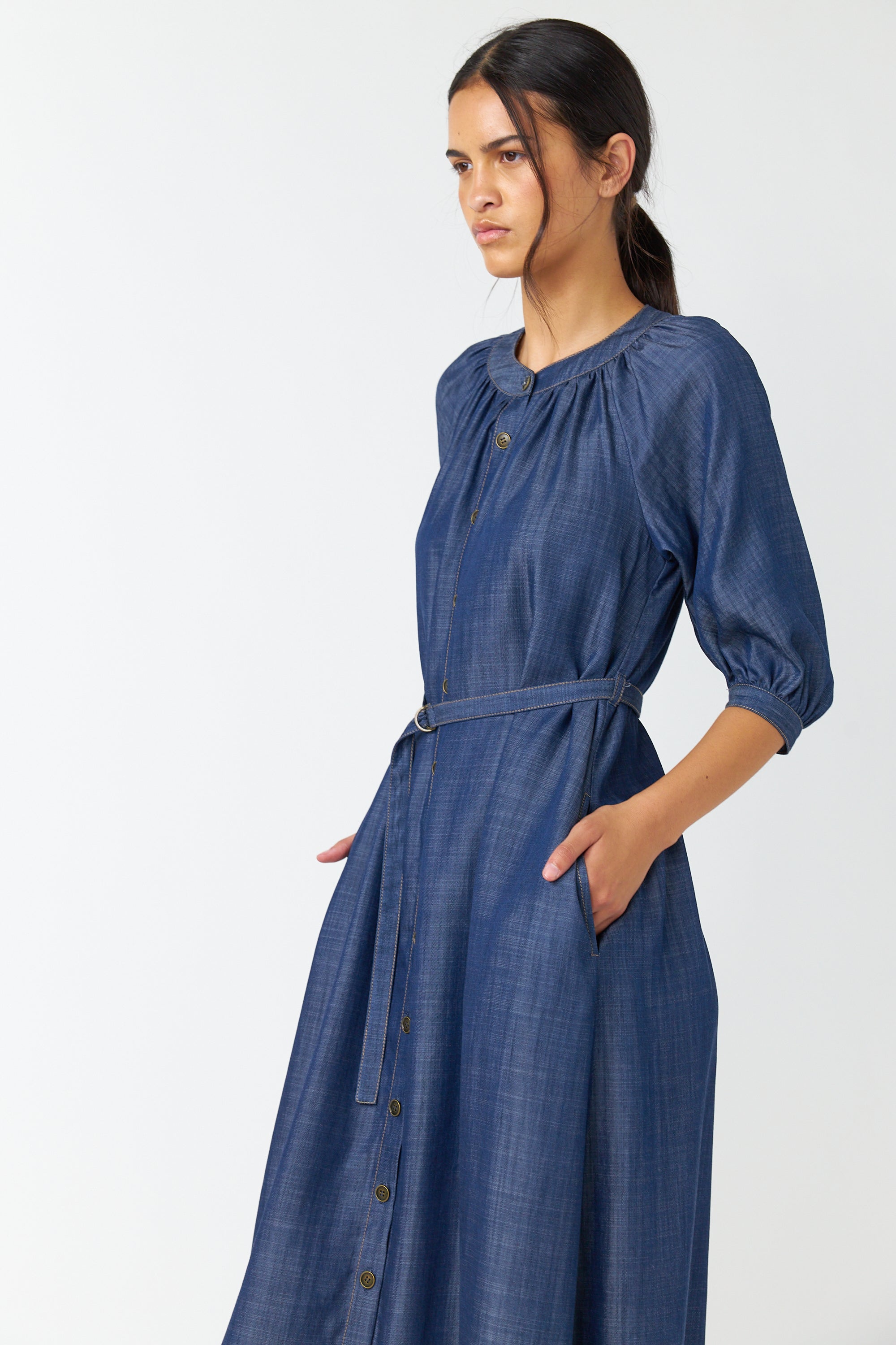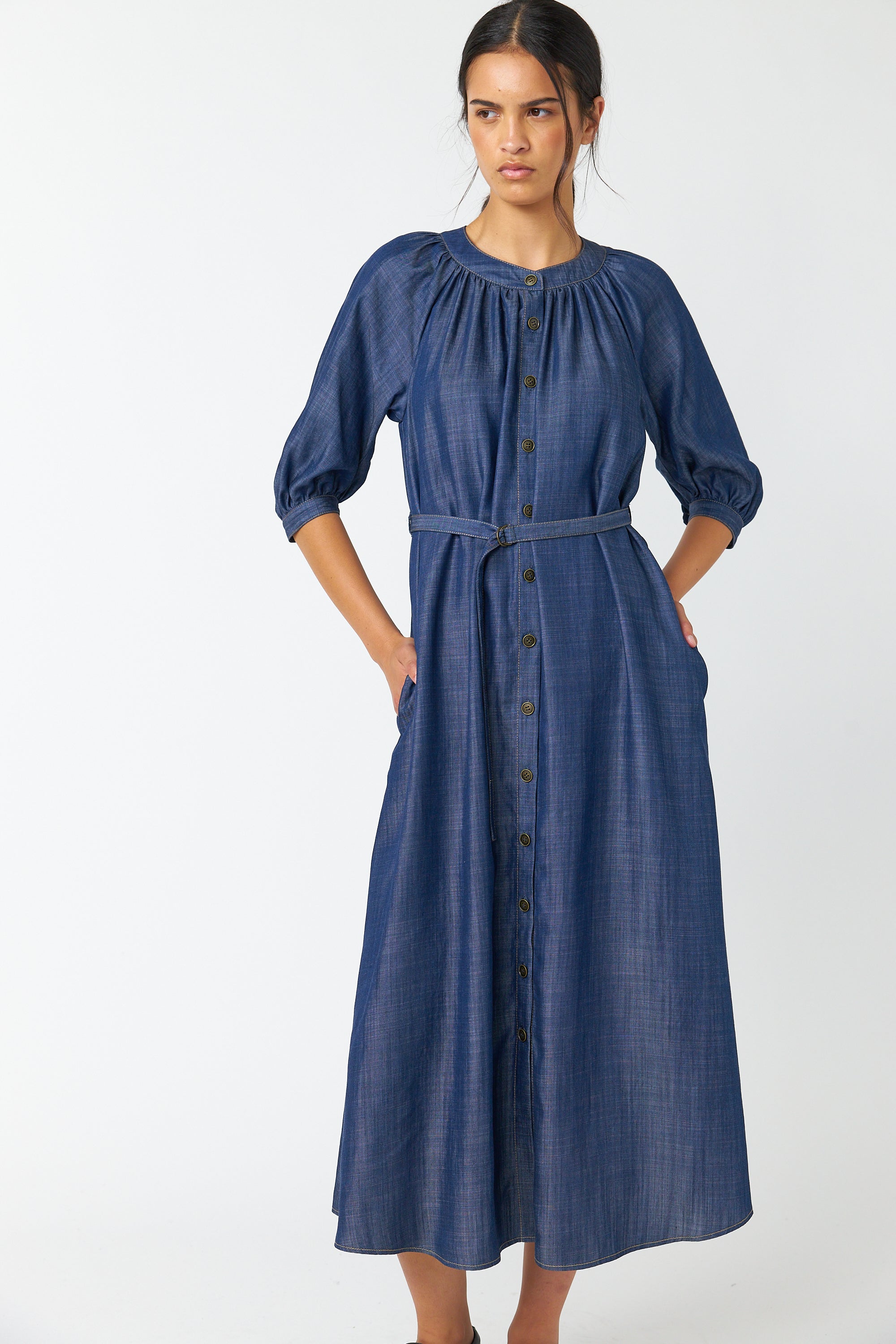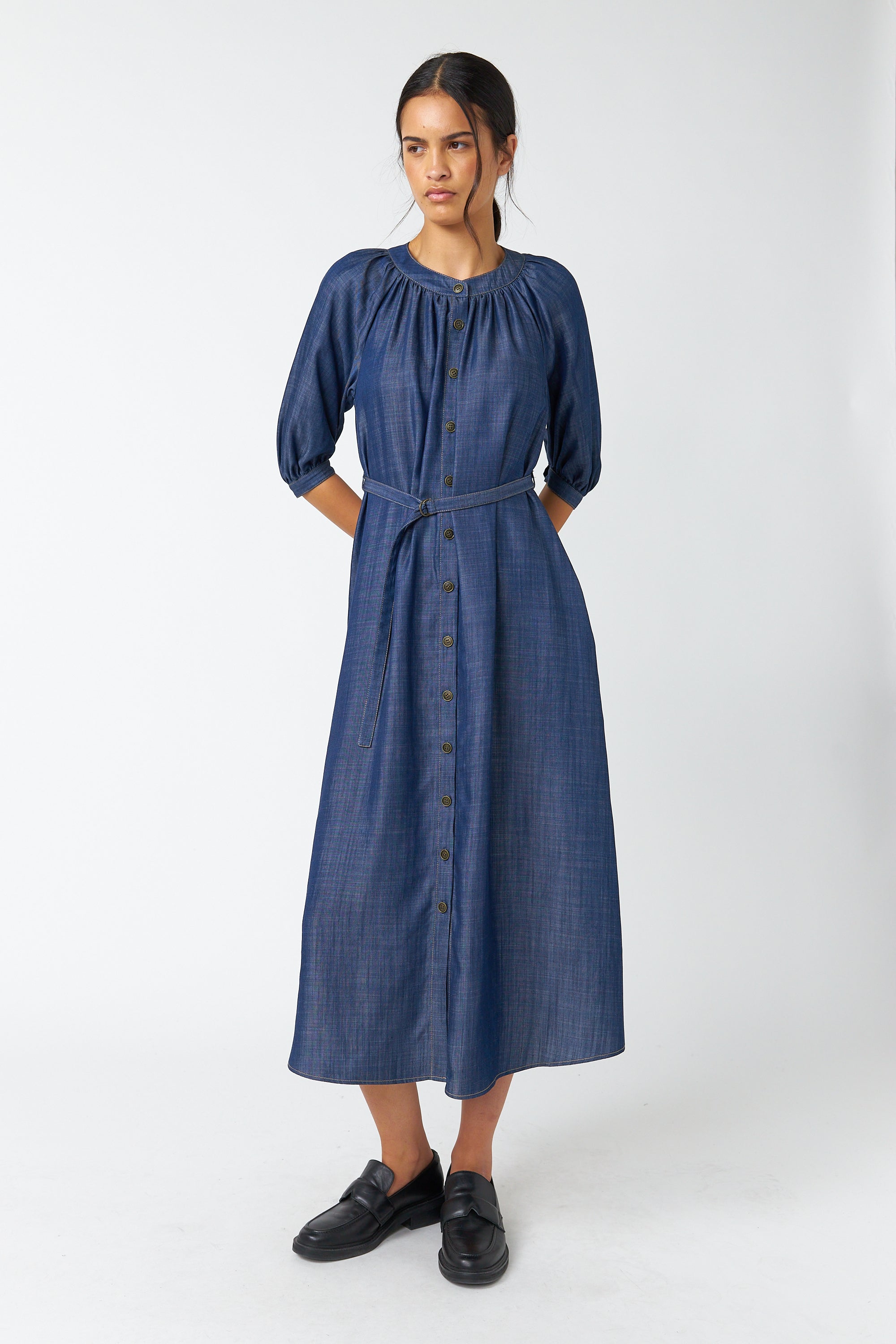 The Traveller dress is a midi-length style with a round neckline featuring soft gathers, a button-through front and 3/4 length sleeves that gather into a cuff. It comes with a d-ring belt to cinch in the waist and practical side seam pockets. Style with boots or loafers as worn here.