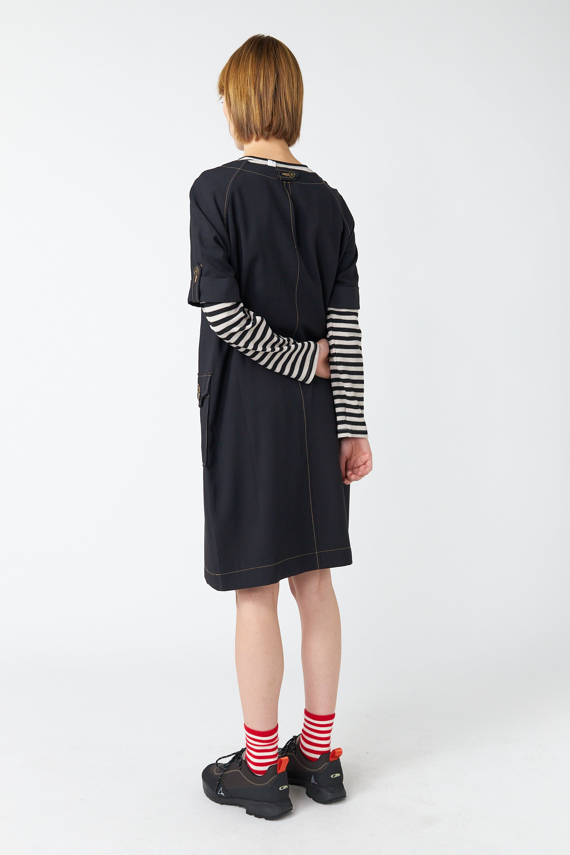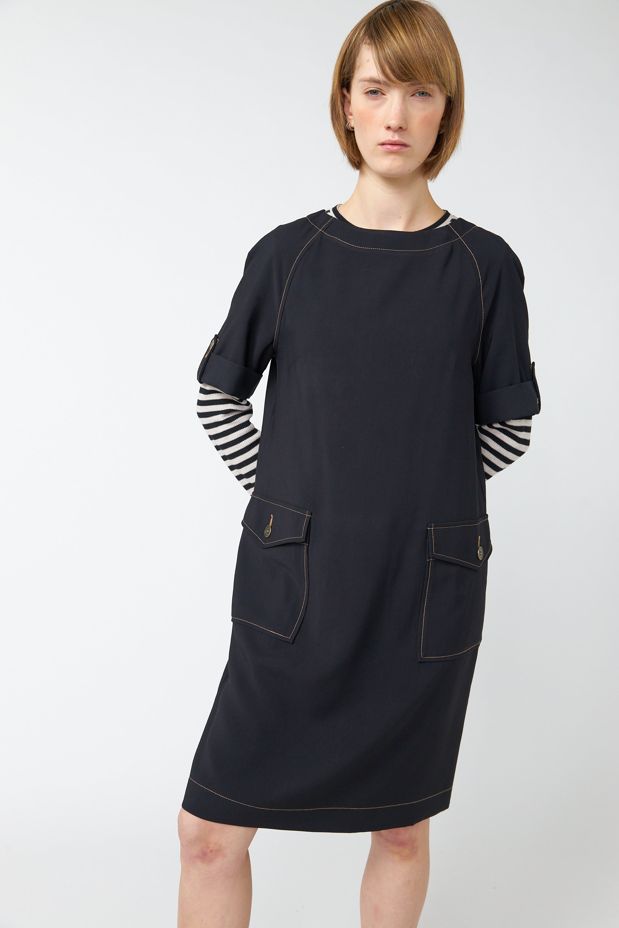 The Traveller sack dress is a relaxed shift style dress that falls to the knee. Featuring a flattering boat neckline, short rolled sleeves, front patch pockets and contrast stitching. Layering it with our makes it a great transeasonal piece.Lola is 5'7 and wears size 6.
