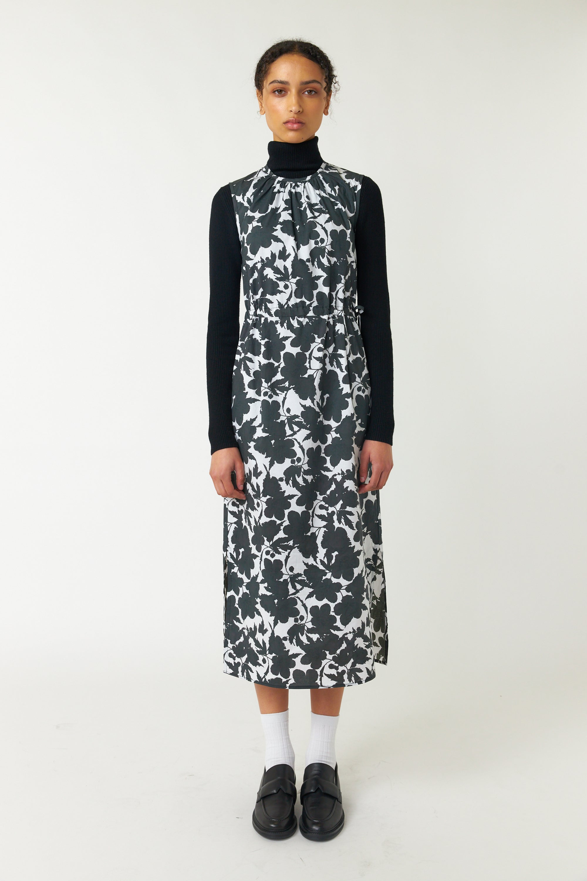 Our Wild rose dress looks great layered up for the cold but will transform into a sundress come summer. It is semi fitted and finishes mid calf with charming side splits in the skirt. There are soft gathers at the neck and an adjustable drawstring at the waist so its effortlessly comfortable. Wear with our underneath on colder days.
