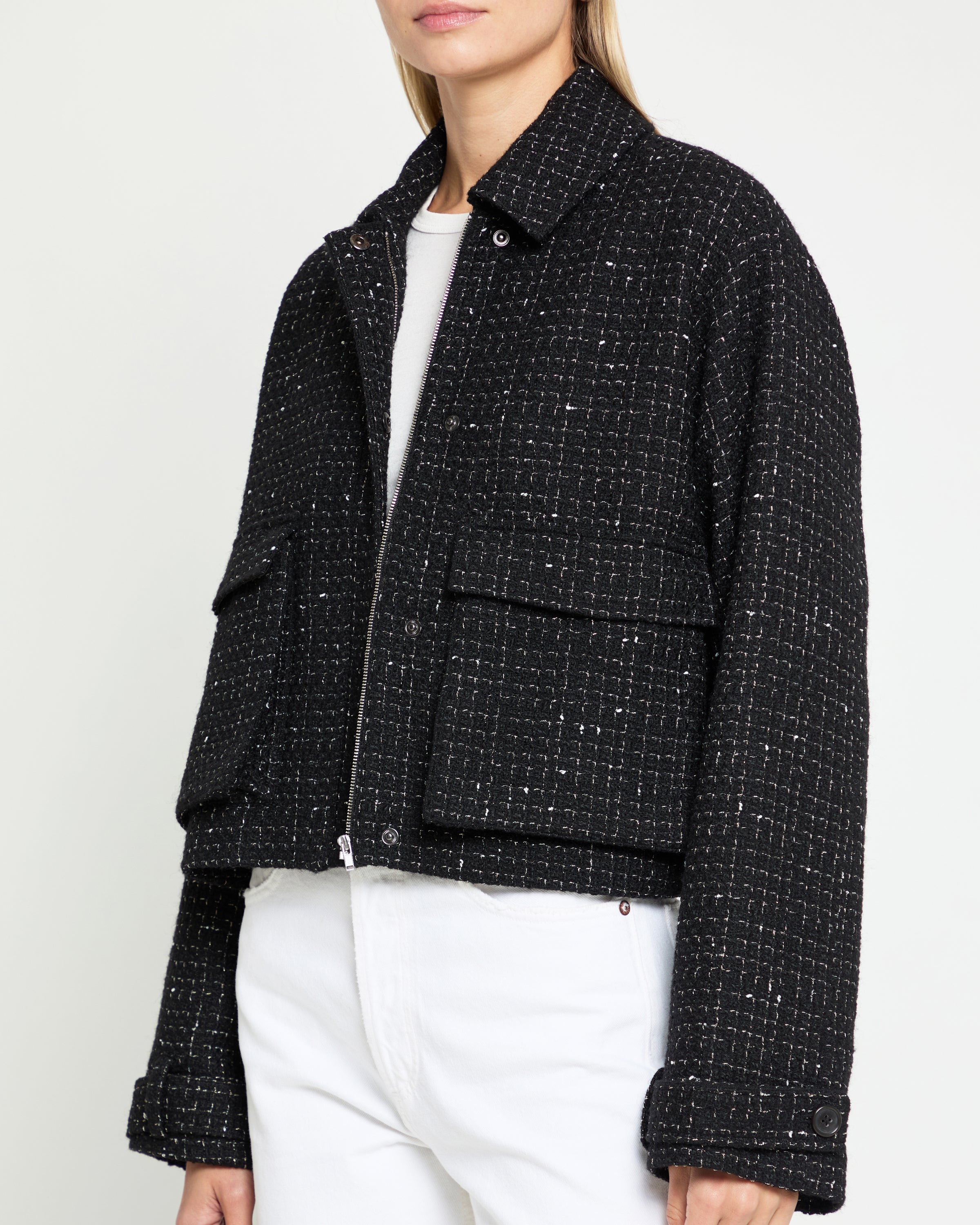 Upgrade your style with our Ettie Jacket. Made from thick and structured tweed, this cropped jacket is easy to dress up or down. Featuring a stylish collar and detailed front pockets, it's the perfect addition to any wardrobe.