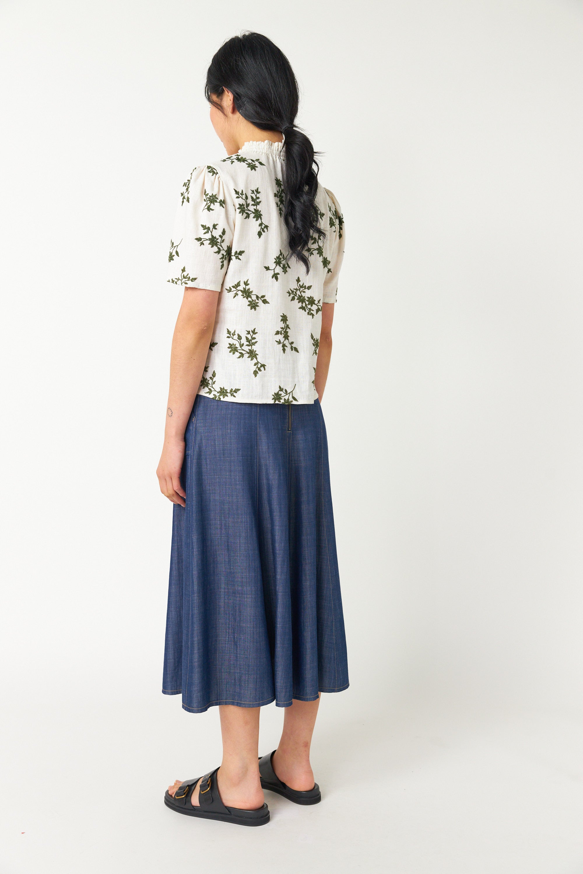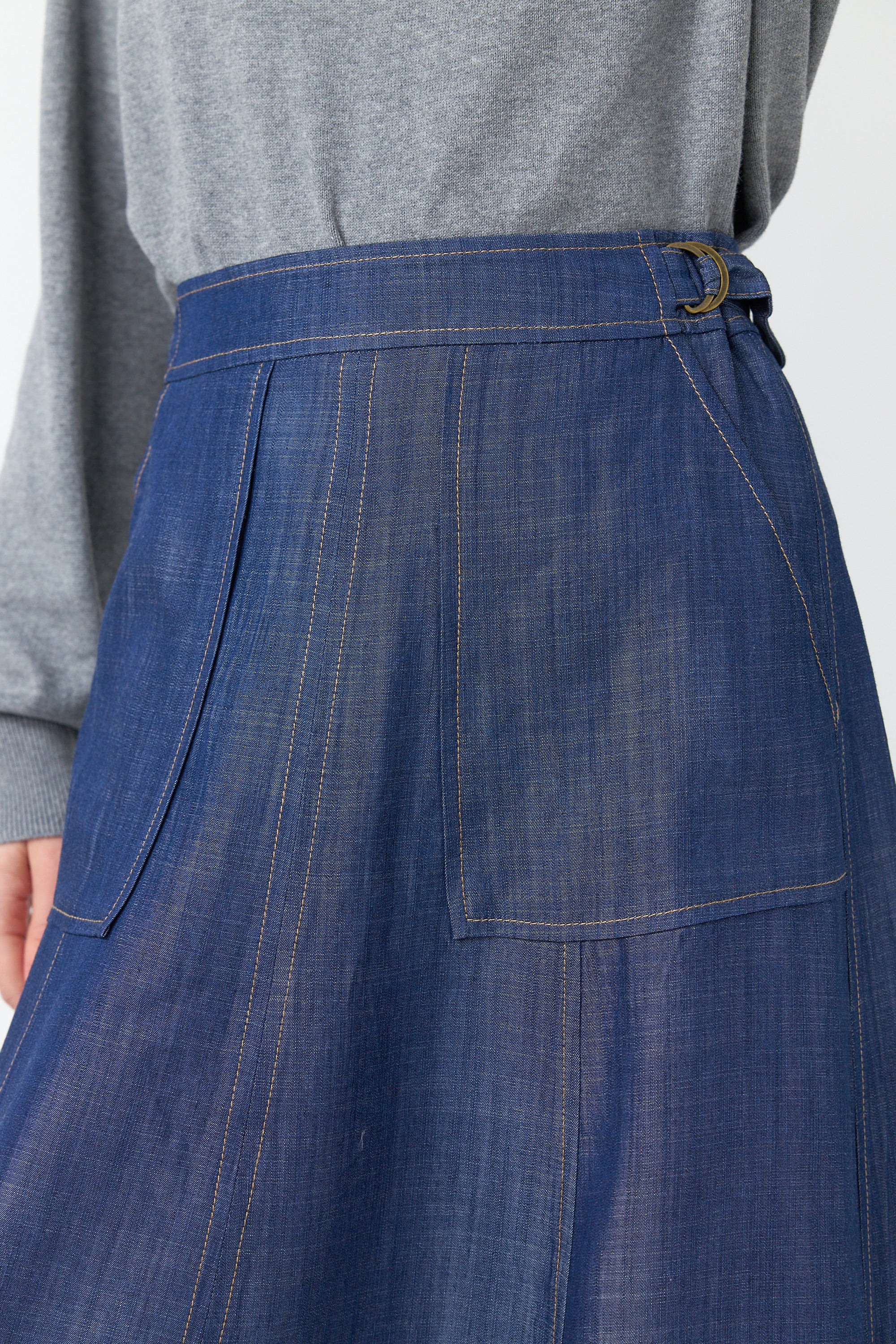 The Traveller skirt is an effortless midi-length style featuring two front patch pockets, pull-tabs at the waistband for a customizable fit and top-stitch detailing throughout. Pair with the for an effortless look.